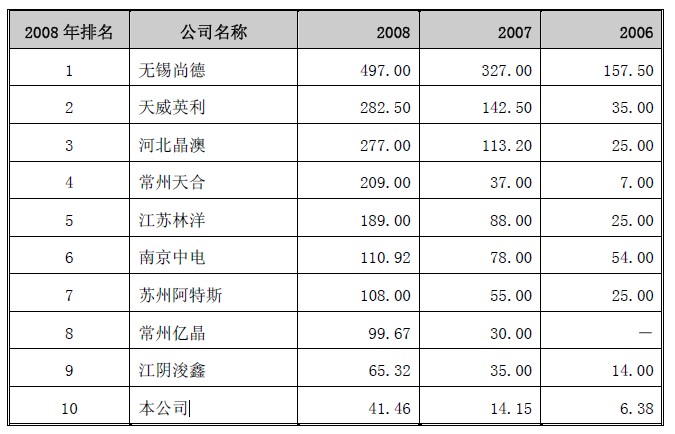 2006-2008年我國太陽能電池產(chǎn)量排名(單位:MW)
