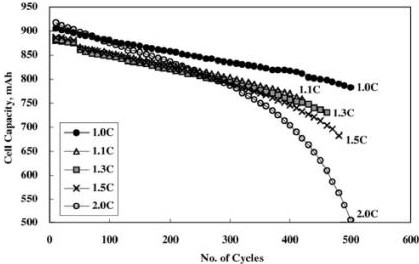 下面是一個4.2V/900mAH LiCoO2電芯的不同電流充電與電池容量的關系曲線(參圖一), 我們可以看出大約500個充放周期后,小電流充電的電池容量明顯大于大電流充電的電池容量。