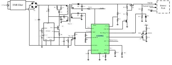 通過與前端PWM芯片的結合,OZ8981將幫用戶快速的實現安全高效且低成本的鋰離子電池充電器設計。