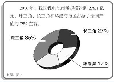 從2010年中國鋰離子電池產業產值分布中可以看出,我國的鋰電池產業主要集中分布在以廣東地區為代表的珠三角、以江浙為代表的長三角和以京津地區為代表的京津唐地區。同時,由于鋰電池的產業鏈向上游延伸到了鋰礦資源,因此以江西宜春、四川阿壩、青海和西藏等為代表的鋰礦資源豐富的地區則具備了發展鋰電池產業得天獨厚的條件,這些地區紛紛提出了適合于自身的鋰電池產業發展思路。