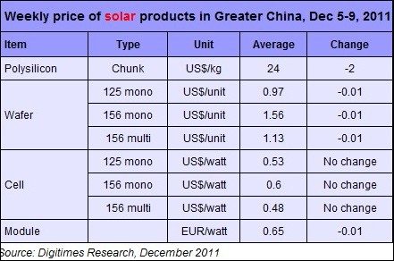 DigitimesResearch分析師DigitimesResearch表示,上周(12月5日-12月9日)大中華區(qū)太陽能電池片現(xiàn)貨價格停止下滑。由于企業(yè)一直在削減產能,有選擇的接受訂單,過去幾周太陽能電池片現(xiàn)貨價格表現(xiàn)的十分穩(wěn)定。太陽能電池片制造商不愿意為了獲得訂單而降低價格。