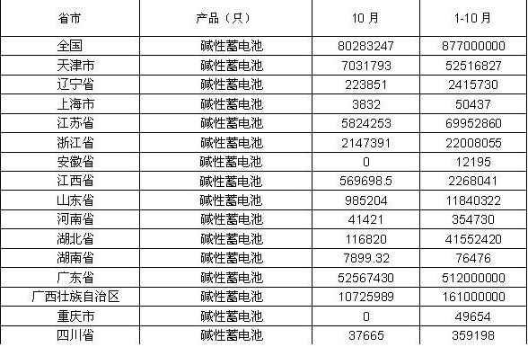 統(tǒng)計(jì)數(shù)據(jù)顯示2011年1-10月中國堿性蓄電池產(chǎn)量為877000000只。