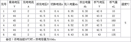 試驗時間是在冬季,水溫5℃。實驗條件是統一用2A電流充電,最充電電壓分別用43V、44V、45V輪循環依次進行,浮充轉換電流一律400mA,記錄下每次的充電時間,包括充電末期隨時間電流下降各點數據、開始析氣電壓,按時間記錄析氣量。電池充完后,用萬分之幾精度的電量臺記錄放電容量。充入電量是在計算紙上讀出時間電流曲線與坐標之間的面積(電容量就是充電電流對時間的定積分)。