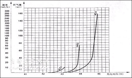從上圖表可以看出,電池在42.5V~43.5V時開始析氣,而析氣的速度與充電電壓有關。到充電結束時,總析氣量與充電最高電壓有關,43V與45V總析氣量相差10位(注:以單格允許極限失水10克,18格相當240公升氣體,該電池45V時失水并不大)。在充電末期電流下降區時,只要降低電壓到42.5V時,析氣立即停止,這時充電電流稍小一點,還會依著原來的規律下降。