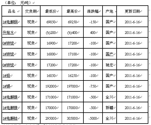- 2011年6月16日長江有色金屬現(xiàn)貨上午快訊(銅鋁鉛鋅錫鎳)