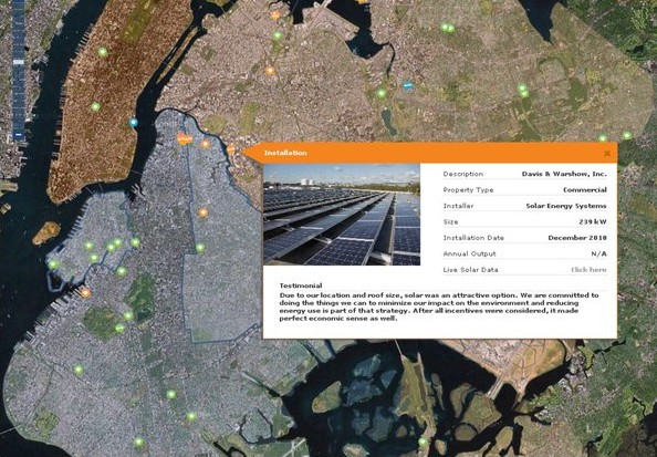 紐約市約有一百萬多幢大樓,互動地圖通過一系列飛機雷達探測進而得出數據,展示了每一棟大樓屋頂的太陽能潛力。飛機收集了建筑物屋頂形狀、角度、面積及周圍的樹木和建筑物投射的陰影等精確信息。