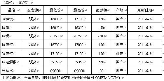 2011年6月3日廣東有色現貨報價(南儲)(銅鋁鉛鋅鎳鈷鎘錳鎂鉍)