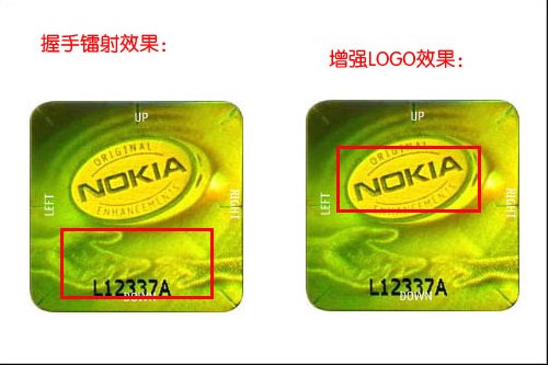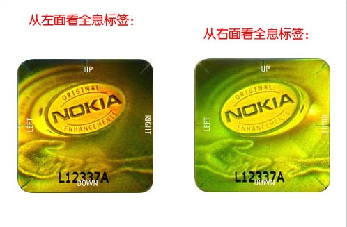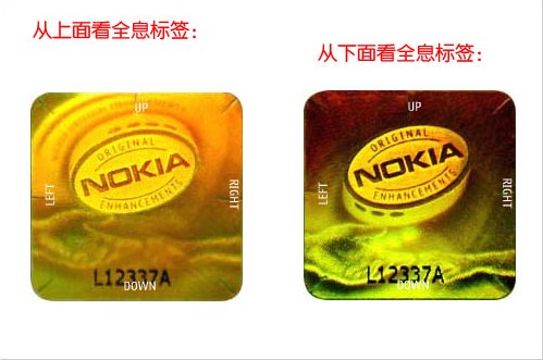 諾基亞從2008年5月生產的零售電池開始,均采用射頻標識防偽技術打擊假冒電池,即NFC(NearFieldCommunication,近距離通信)驗證方案。消費者以通過諾基亞客戶服務中心獲得NFC驗證:國內所有諾基亞客戶服務網點都配置了讀取終端,以便消費者方便地獲得免費查詢服務。 以下是諾基亞原裝電池的鐳射全息標簽辨別圖示。