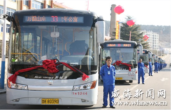 昨日上午9時30分許,在位于環翠區鯨園街道辦事處萬福山莊外的33路公交首發站點,首批10輛披掛大紅花的公交車依次啟動,投入到33路公交線路的運營中。