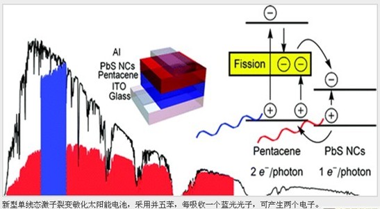 文章中說:“我們演示了一種有機/無機混合的光伏設備架構,采用單線態激子裂變(singlet exciton fission),每吸收一個高能光子,可以收集到兩個電子,同時,也可以利用低能量的光子。這種太陽能電池,紅外光子吸收使用硫化鉛(PbS: lead sulfide)納米晶體?梢姽夤庾拥奈詹捎梦瀛h素,以創造單線態激子,經過快速激子裂變,產生配對三重線態(triplets)。最重要的是,我們確定,這些三重線態激子可以電離,這要采用有機/無機異質結面(heterointerface)。我們報道的內部量子效率超過50%,而功率轉換效率接近1%。這些結果表明,有一種替代方法,可以規避肖克利-奎伊瑟極限(Shockley-Queisser limit),就是單結太陽能電池(single-junction solar cells)功率轉換效率的極限。”