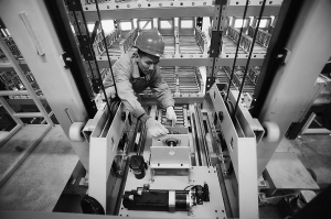 換電站技術人員對剛安裝好的堆垛機(用于自動取電池)進行檢查。徐福興 攝