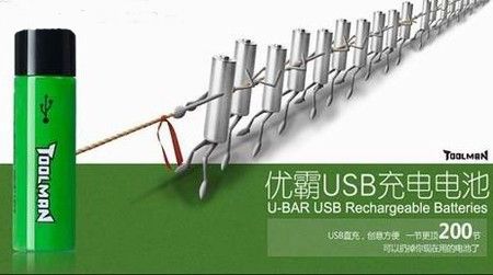 這款優霸USB充電電池是裝備品牌Toolman最新推出的產品,外形看起來跟普通的AA電池沒有什么區別,它的特別之處在于,只要將插頭插到電腦的USB接口上即可。充電完畢后,把用于連接的陽極蓋子蓋好便可如普通電池一樣進行使用,臺式機、筆記本、鍵盤、游戲主機等都可以為補充能量。